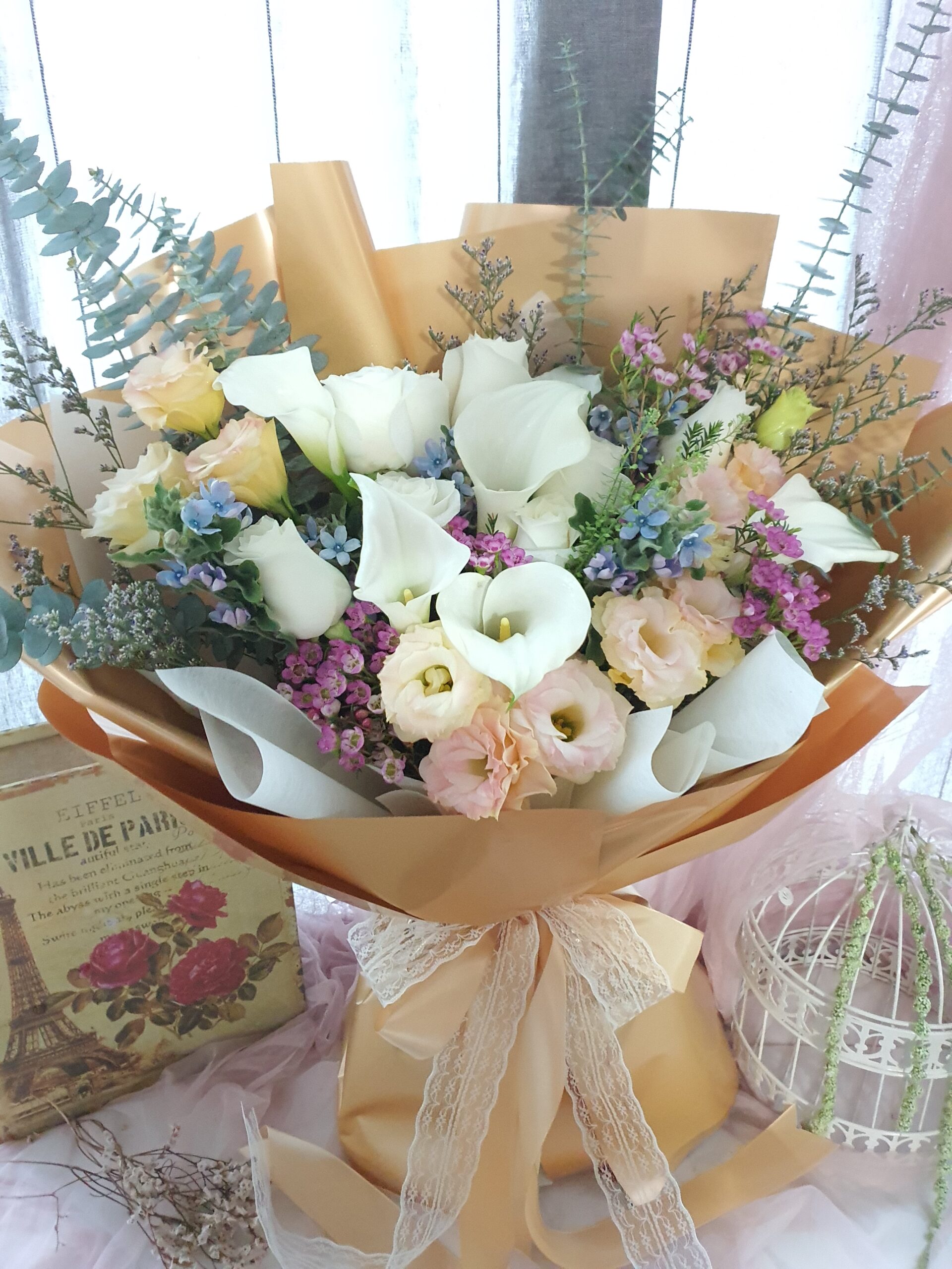 Bouquet of calla lilies, white roses , oxy blue and various filler flowers …